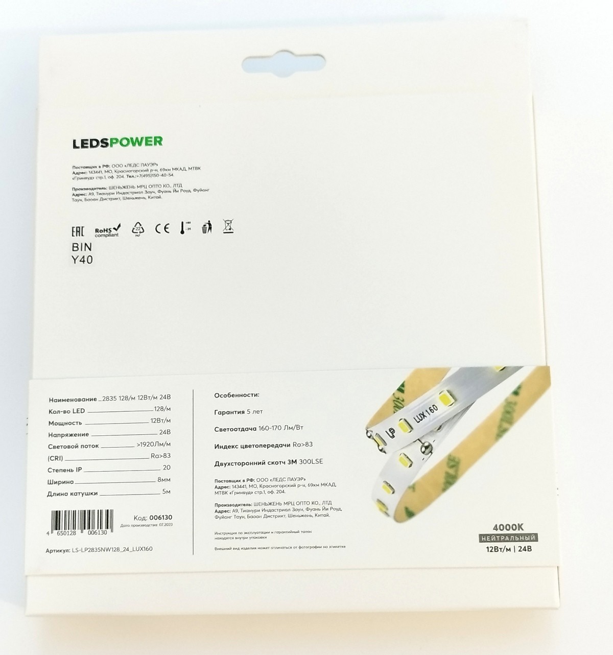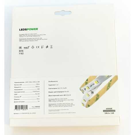 Однорядная светодиодная лента высокого качества Leds Power с белой подложкой. Обладает высоким индексом цветопередачи Ra>80, сопоставимым с естественными источниками света. Степень защиты данной модели IP20, количество светодиодов 128 на метр, при общей длине ленты 5м, мощность составляет 12Вт на метр, напряжение 24В. Рекомендуется для профессионального применения.