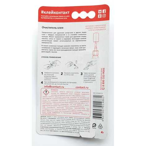 Очиститель для удаления супер-клея и других видов клея с твердых поверхностей и со случайно склеенных пальцев.