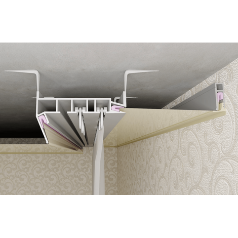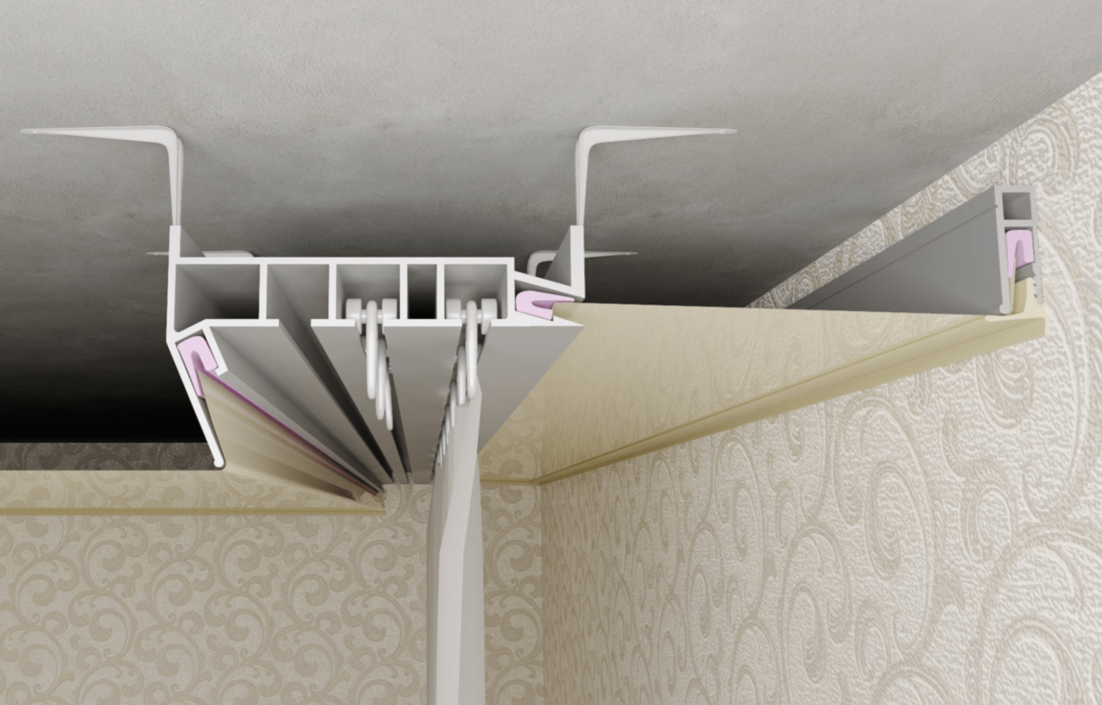 Данный профиль представляет собой шину потолочной гардины, совмещенную с отбойником и крепежным элементом гарпуна. Крепежный элемент для гарпуна также предусмотрен с тыльной стороной гардины. Благодаря этому, Вы можете затянуть пространство между стеной и гардиной, полностью убрав неприглядный черновой потолок. Также возможна установка светодиодной подсветки.