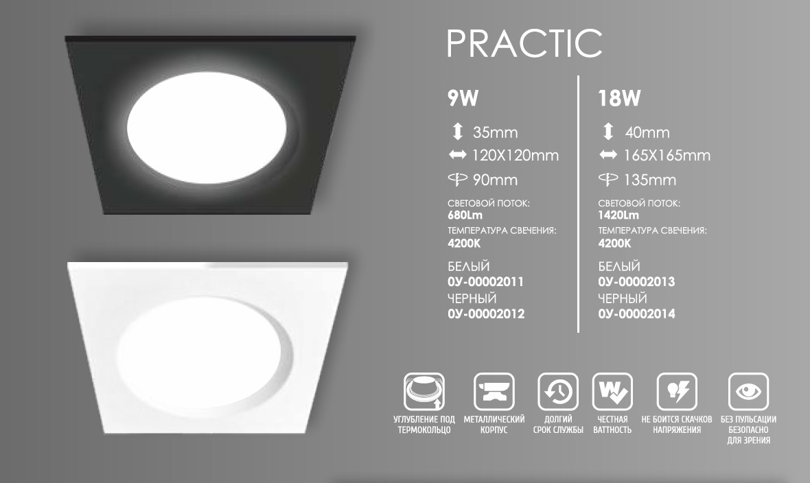 Светильник LED Панель Квадрат PRACTIC, 9W, 4200К, Белый, 120хD90х35